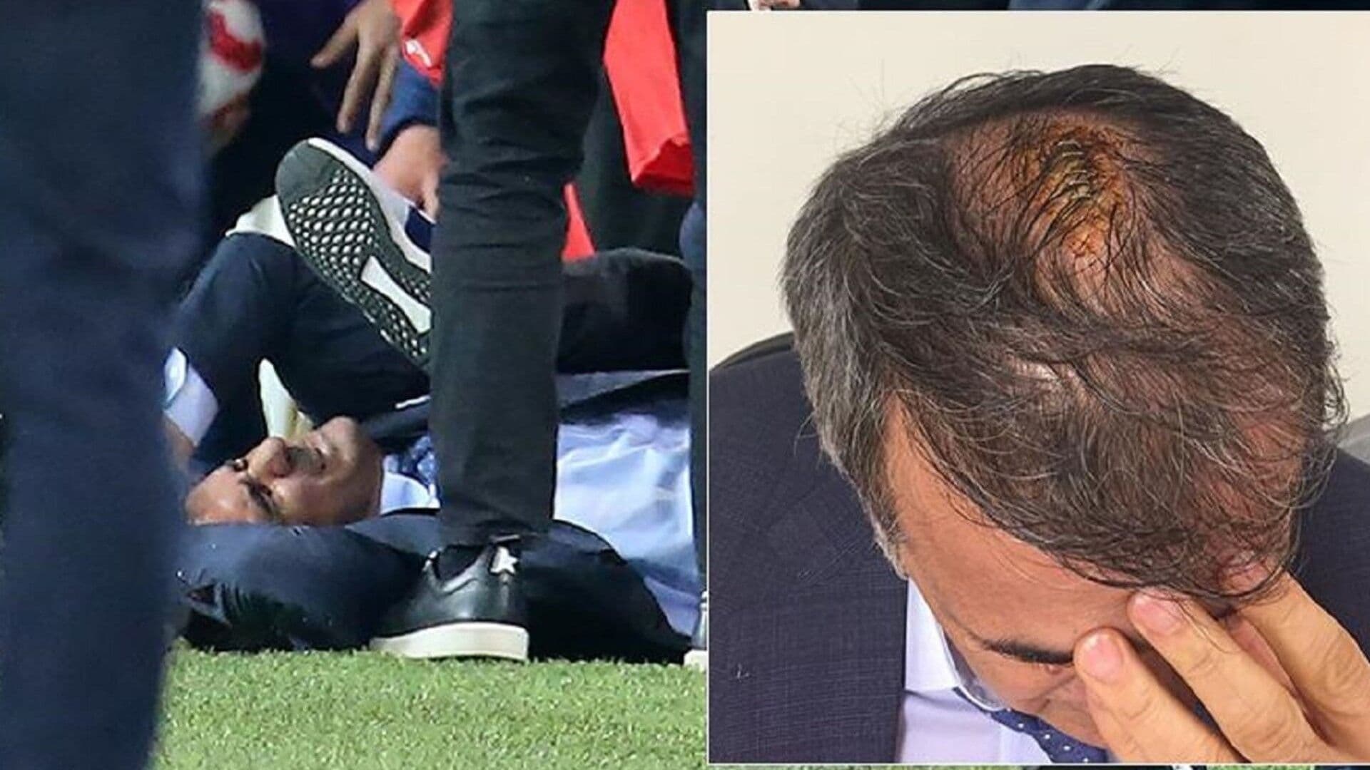 Beşiktaş Teknik Yöneticisi Şenol Güneş’in Fenerbahçe maçında başına aldığı darbe sonucu yerde kaldığı anlar.